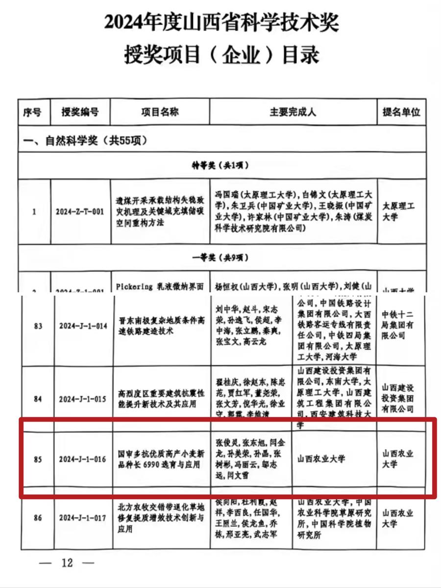 近日,山西省人民政府发布了《关于2024年度山西省科学技术奖励的决定》,我所申报的“国审多抗优质高产小麦新品种长6990选育与应用”项目获2024年度山西省科学技术进步奖一等奖。